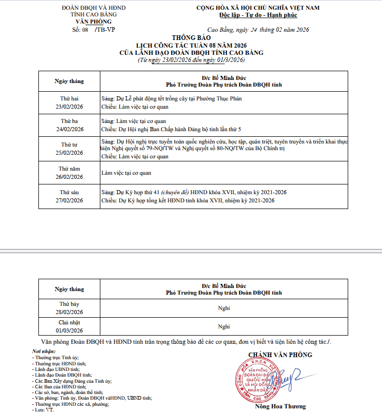 Thông báo Lịch công tác tuần 08 năm 2026 của lãnh đạo Đoàn ĐBQH tỉnh