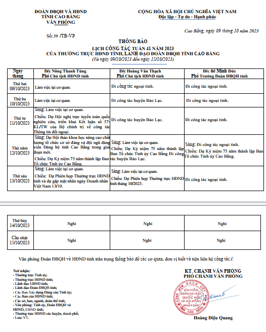 Thông báo Lịch công tác tuần 41 năm 2023 của Thường trực HĐND tỉnh, lãnh đạo Đoàn ĐBQH tỉnh