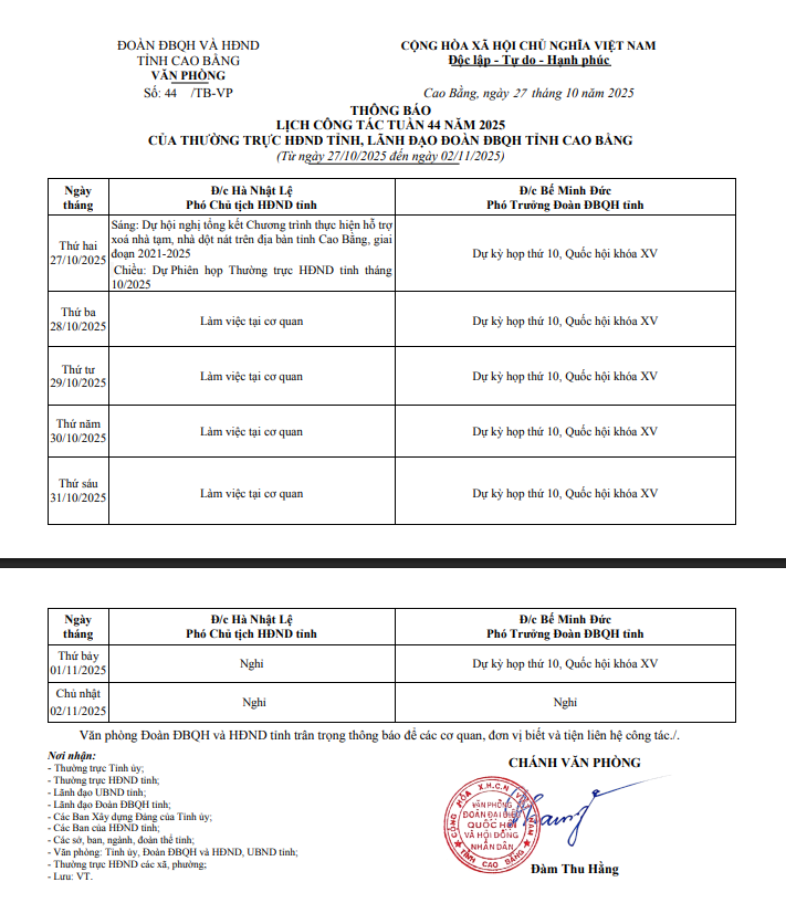 Thông báo Lịch công tác tuần 44 năm 2025 của Thường trực HĐND tỉnh, lãnh đạo Đoàn ĐBQH tỉnh