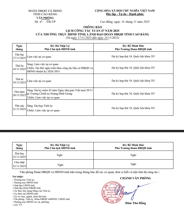 Thông báo Lịch công tác tuần 47 năm 2025 của Thường trực HĐND tỉnh, lãnh đạo Đoàn ĐBQH tỉnh
