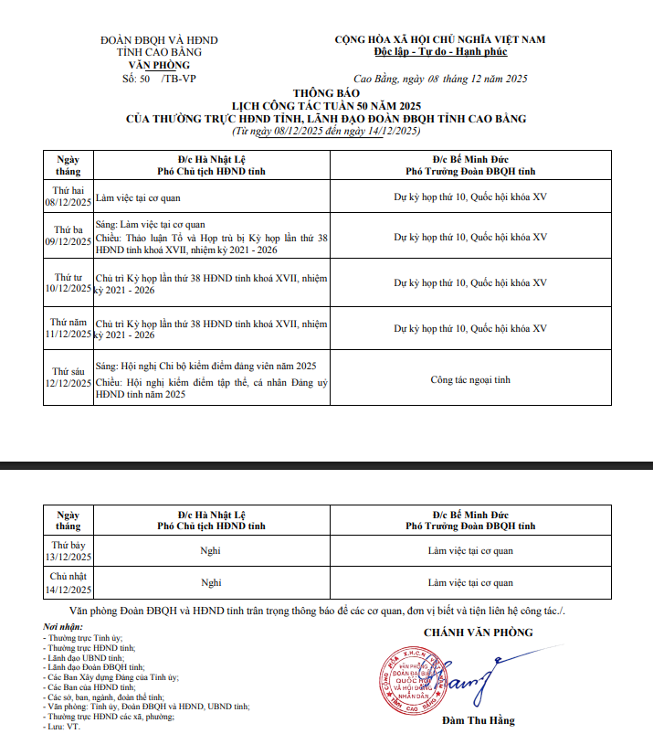 Thông báo Lịch công tác tuần 50 năm 2025 của Thường trực HĐND tỉnh, lãnh đạo Đoàn ĐBQH tỉnh